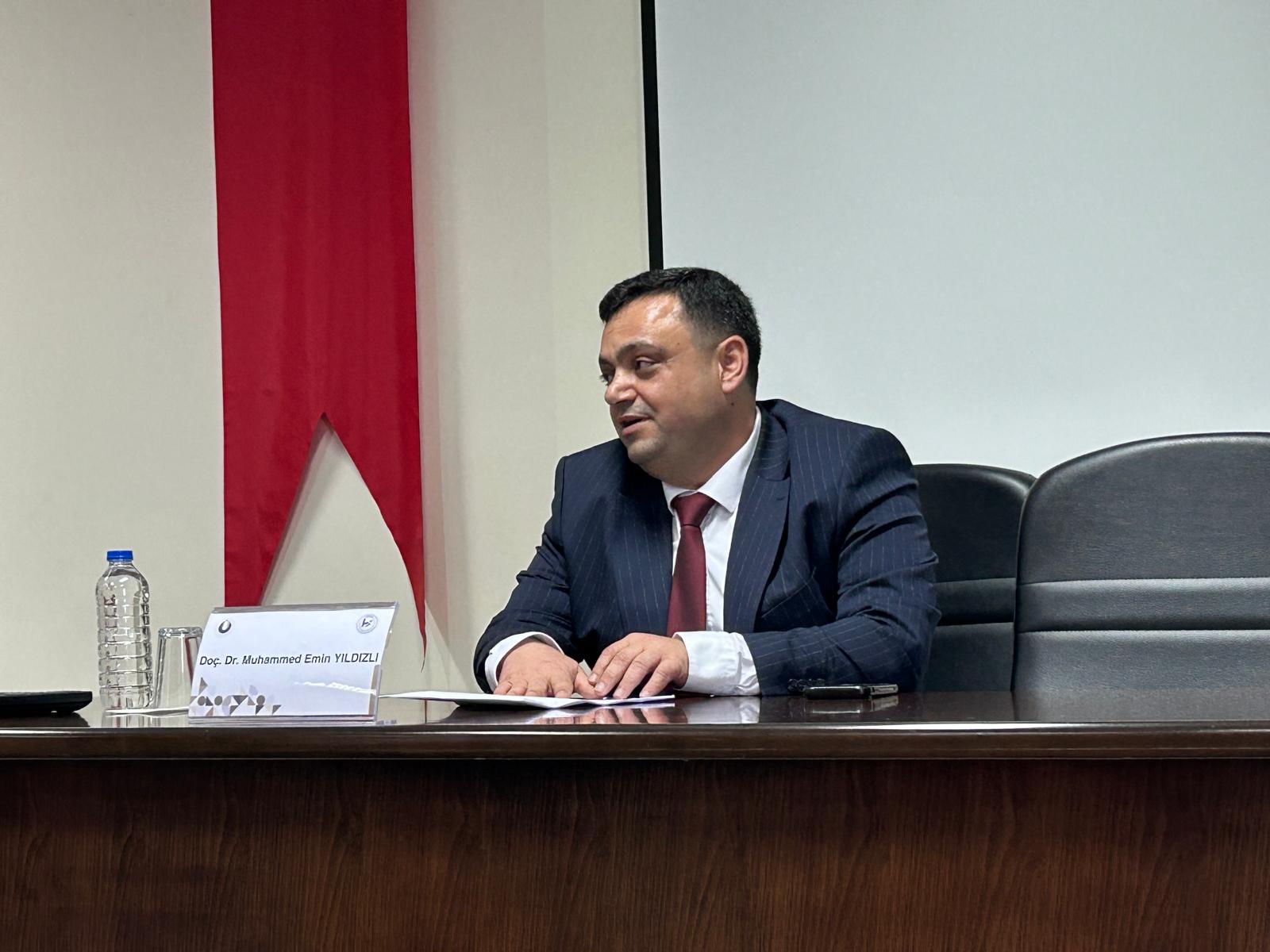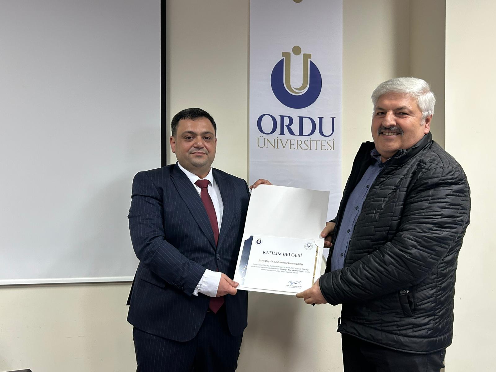 Konferansın ardından Doç. Dr. Muhammed Emin Yıldızlı'ya Fen Edebiyat Fakültesi Dekanı Prof. Dr. Selahattin Maden tarafından katılım belgesi takdim edildi.